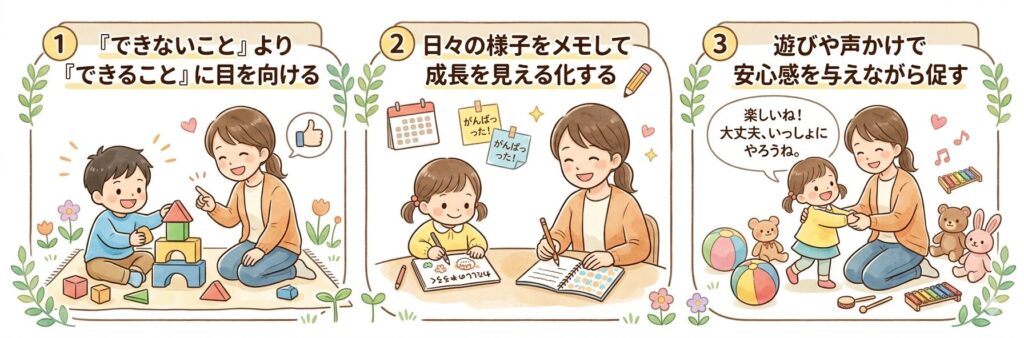 できていることに注目すると、子どもへの声かけが自然と前向きになります。子どもも安心して次のステップに進みやすくなります。